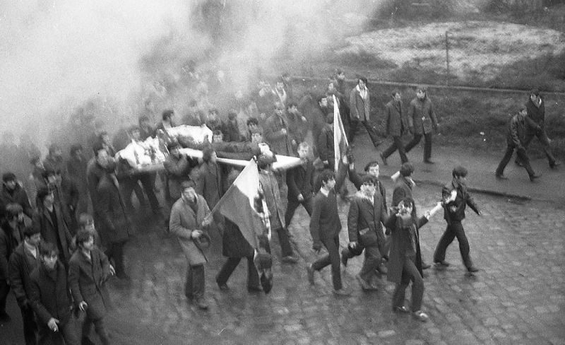 Ponieśli go Świętojańską, naprzeciw glinom, naprzeciw tankom… Przemarsz młodzieży z ciałem zabitego Zbyszka Godlewskiego, nazwanego wkrótce w Balladzie grudniowej Jankiem Wiśniewskim. Na biało-czerwonej fladze krew zabitego. Ten dzień przeszedł do historii Gdyni, Szczecina i całej Polski jako Czarny Czwartek. Foto z archiwum IPN.