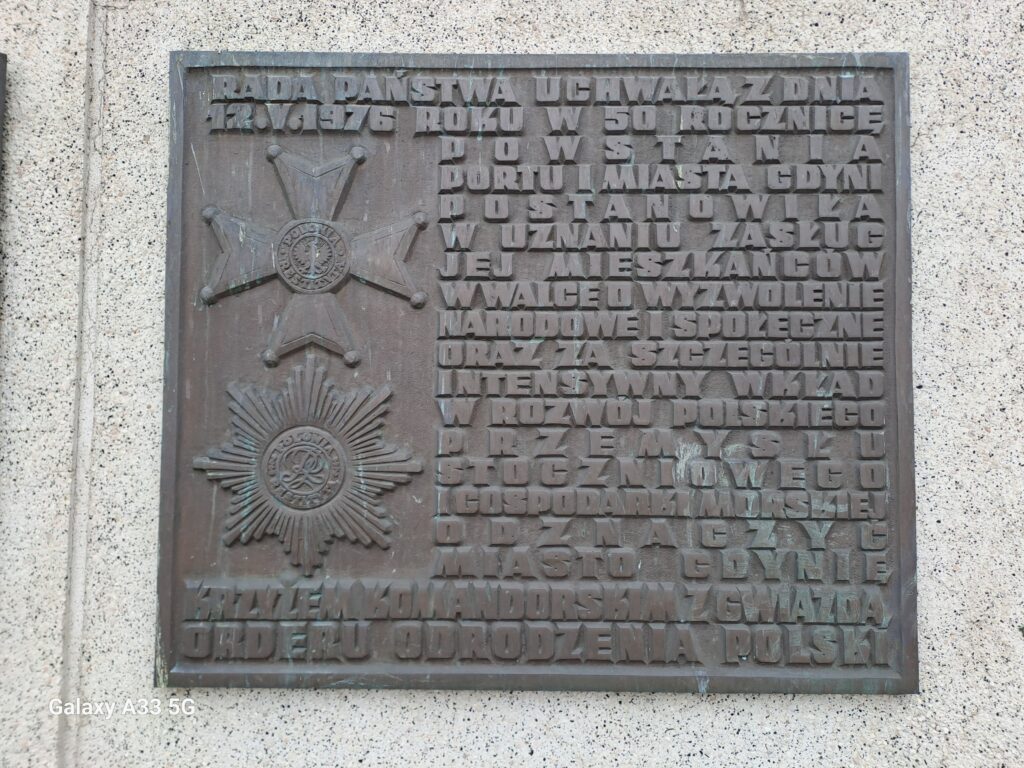 obok sowieckiej tablicy „orderowej” wisi inna, informująca, że w maju 1976 Rada Państwa PRL odznaczyła Gdynię Krzyżem Komandorskim z Gwiazdą Orderu Odrodzenia Polski, m.in. za „walkę o wyzwolenie społeczne”. Ta sama Rada Państwa, która 5 lat później obklei Polskę obwieszczeniami o nielegalnym „stanie wojennym”, firmując i „legalizując” zamach stanu, dokonany przez juntę Wojciecha Jaruzelskiego!