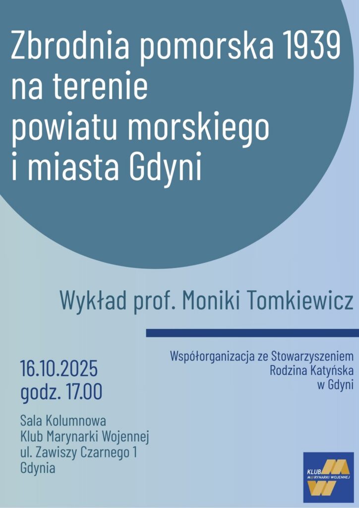 Zapraszamy na wykład prof. Moniki Tomkiewicz – Zbrodnia pomorska 1939 na terenie powiatu morskiego i miasta Gdyni. Wykład odbędzie się w dniu 16.10.2025 o godz.: 17:00 w Sali Kolumnowej Klubu Marynarki Wojennej przy ul. Zawiszy Czarnego 1 w Gdyni.